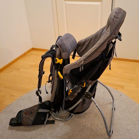 Rinkka lapsen kantamiseen, sisältää useita taskuja sekä säädettävät olkahihnat ja pehmustetun vyötärövyön laajalla säätövaralla.