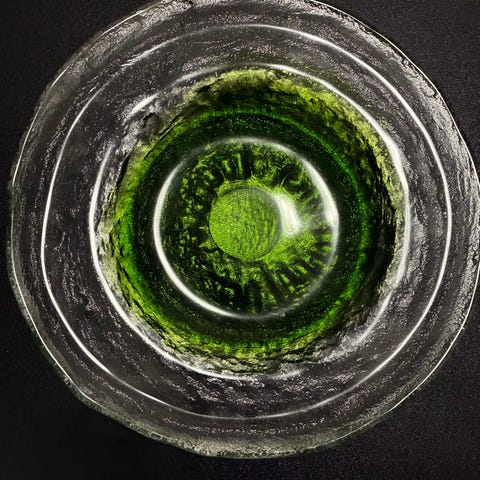 Pertti Santalahden Humppilan Lasille suunnittelema vihreä-kirkas keskipakoisvalettu Kivi-Set kulho. Halkaisija 18 cm, korkeus 12 cm. Painavaa lasia 70-luvulta. Kulkeutuu Jyväskylään suuntaan.