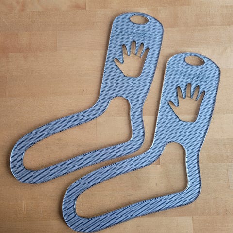 Valkoista muovia. Soveltuvat naisten sukkien (noin koko 38) pingottamiseen.