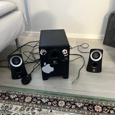 Logitech kaiutinjärjestelmä, joka sisältää kaksi pientä kaiutinta ja subwooferin. Väri valkoinen. Toimii moitteettomasti. Myyn pois muuton tieltä. Vain nouto.