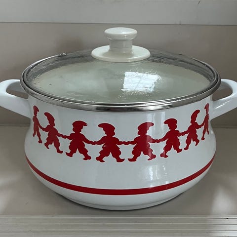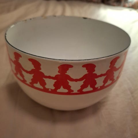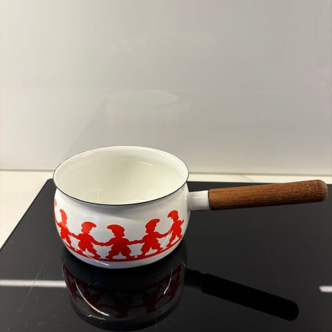 FINEL, Wärtsilä, puuvartinen emalikasari panssariemaloitua terästä, varsi teakia. Vetoisuus 0,5 l, korkeus 7 cm, halkaisija 12 cm, varren pituus 12 cm.Valkoisella pohjalla 14 oranssipunaista tonttua piirissä. Muodon suunnittelu Kaj Franck, kuvion suunnittelija tuntematon, tuotannossa 1971-1975. Sopii kaikille liesille. Kunto erinomainen. Nouto tai postitus pakettina € 8,90. Maksu käteisellä tai tilille. Huom en lähetä pakettia Toridiilillä eikä minulla ole Mobile Payta.