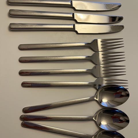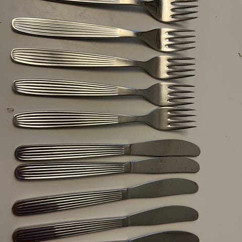 Sisältää 5 veistä ja 5 haarukkaa. Pituus noin 17,5cm . Veitsissä on käytön jälkiä, ks kuvat. En ole yrittänyt mitenkään kiillottaa tai poistaa kun ei ole häirinneet.