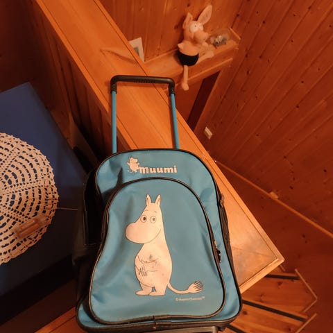 Puinen Muumi-kävelykärry. Vastusta ja kahvan kulmaa voi säätää. Käytön jälkiä on, mutta toimii normaalisti. Nouto Olarista, maksu MobilePayllä.