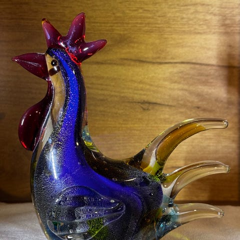 A&M Lasivitriini oli toiminnassa vuosina 1986-1993, eli kyseessä todellakin vintage taideteos. Kukko on käsintehty läpikuultavasta violetista lasista, ja se pääsisi oikeuksiinsa kunnollisesti valaistussa vitriinissä.