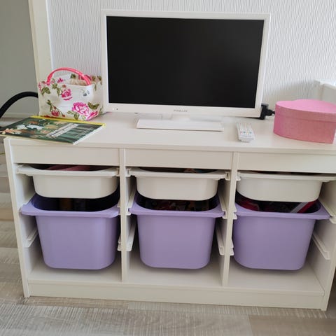 Hyvä kuntoinen Trofast. Mukaan neljä pientä keltaista laatikkoa ja kuvasta poiketen neljä keskikokoista mustaa laatikkoa.