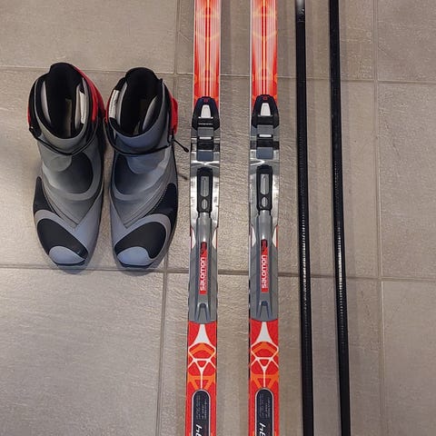 Salomon S/lab monot on valmistajan huippumalli jotka toimivat myös kisakäytössä, vetolenkit auttaa jalkaan laittamisessa, nauhat saa kiristettyä kätevästi pikakiinnityksellä ja nilkkaremmi muoviklipsulla niin ei tarrat kulu ja mono pysyy tukevasti jalassa. Keveyttä ja tukevuutta on haettu valmistamalla monot osittain hiilikuidusta (runko ja pohja). Sauvat on 30% hiilikuitua ja kahvojen korkkipinta ja sauvojen rannetuelliset hihnat tuovat pakettiin nykysauvojen hienoudet. Kokemuksesta voi sanoa että suksien siteet istuu näihin monoihin napakasti ja palauttaa sukset potkun jälkeen tosi tehokkaasti monoon kiinni.