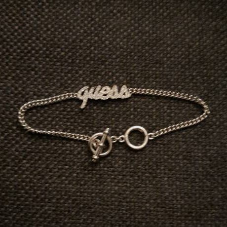 GUESS -rannekoru, hopean värinen ja koristeltu korukivellä. Ollut vähäisellä käytöllä.