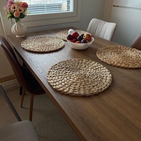 Pöytä ja 2 tuolia.pöydän pinnassa vain vähän käytön jälkeä.tuolit kaipaavat kiristystä ja parempaa putsausta.