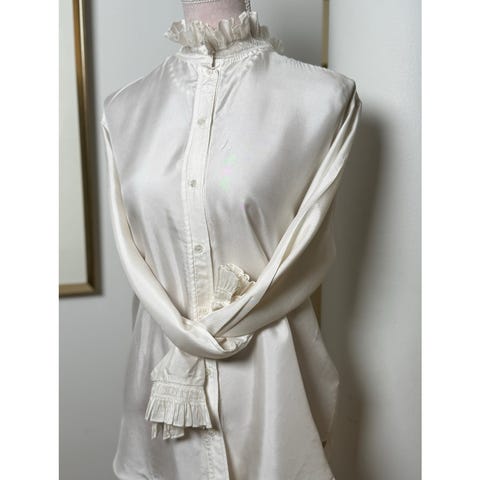 Puserossa on korkea röyhelökaulus, pitkät puhvihihat ja pitsikoristeita V-muotoisissa paneeleissa edessä ja hihansuissa.
