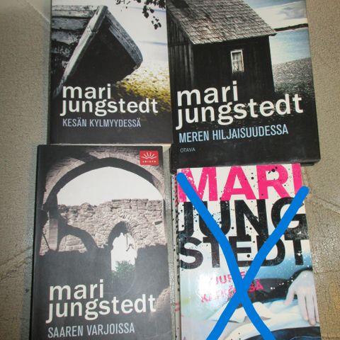 Mari Jungstedt kirjasarja 18 kirjaa: Kesän kylmyydessä, Meren hiljaisuudessa, Saaren varjossa, Muurien kätkössä, Aamun hämärässä, Kevään kalpeudessa, Hiljaisuuden hinta, Vaarallinen leikki, Neljäs uhri, Viimeinen näytös, Joka yksin kulkee, Kullan kallis, Toiset kasvot, Pimeys keskellämme, Näen sinut, Viimeisen lampun loisteessa, Viimeinen tukikohta ja Suljettu huone. Kirjat ovat kovakantisia ja erittäin hyvässä kunnossa.
