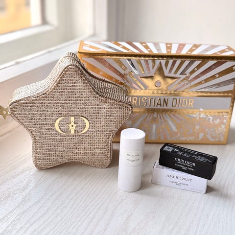 Setti on aivan uusi. Tähtimuotoinen glitter meikkipussuka jossa on Diorin logo. Lahjalaatikon saa mukaan ja paperikassin.