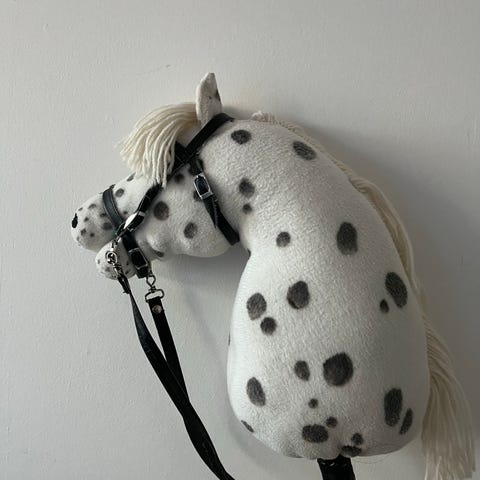 Valkoinen keppihevonen suitsilla ja kuolaimella.