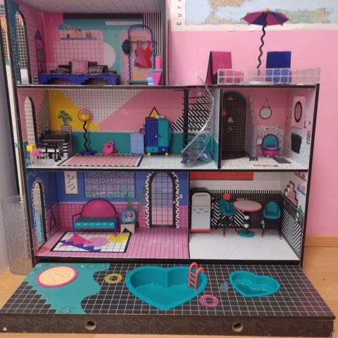 L.O.L. Surprise leikkitalo, jossa on useita kerroksia ja erilaisia leikkialueita. Sisältää liukumäen ja palmupuun koristeen. Sopii lasten leikkeihin.