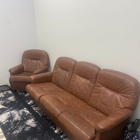 Nahkasohvat 1 ja 3istuttavat. Nahat ehjät muttu kulumaa on.