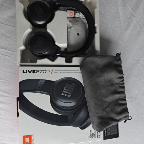 JBL Live 670NC langattomat kuulokkeet, musta väri. Kuulokkeet tarjoavat aktiivisen melunvaimennuksen (ANC) ja langattoman yhteyden Bluetoothin kautta. Mukana on mukautettava ääni ja pitkä akunkesto.