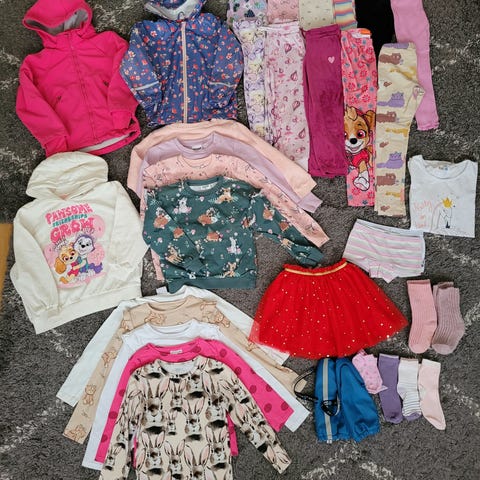 Osa vaatteista ollut käytössä pari kertaa, aika monta täysin käyttämättä eli käytännössä uusia ja osa käytetty enemmän. Myös uudet ja lapulliset. Hupparit, collegepaidat, toppatakki, välihaalari, erilaiset housut, collegehousut, ribbileggingsit, leggingsit jm, pitkähihaiset paidat,