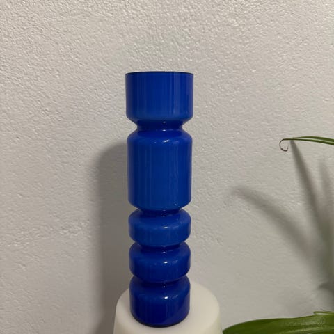 Hienokuntoinen vanha tummansininen lasimaljakko jossa paksu pohja.