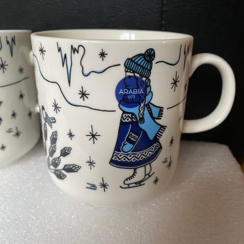 Arabia Piilopaikka mukit, mustavalkoinen kuosi. Mukit ovat posliinia ja soveltuvat mikroaaltouuniin sekä astianpesukoneeseen.