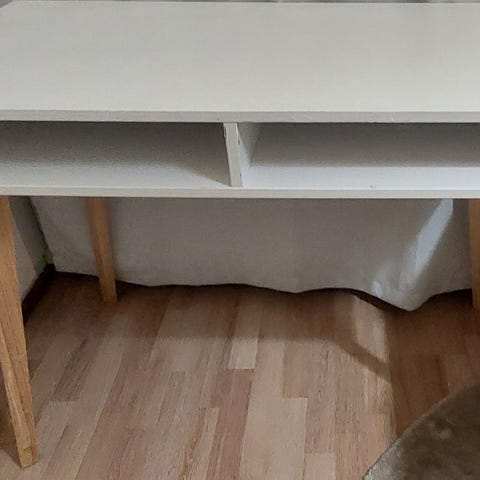 Käytetty työpöytä. Alahyllyssä pieni halkeama. Muuten vielä aivan käyttökunnossa.