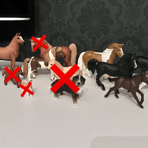 Myydään kokoelma hevosiin liittyviä figuureita ja ratsastushahmoja. Mukana on erilaisia hevoksia, mukaan lukien musta hevonen, yksisarvinen ja ratsastushahmot. Kaikki lelut ovat hyväkuntoisia, osa käytettyjä mutta ehjiä. Jossain leluissa on käytön jälkiä mutta kunto on hyvää.