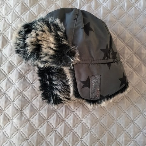 Käyttämätön. Vettähylkivä kangas . Reunoissa ja "lipassa" karvaa, sisusta flanellia. tarrakiinnitys