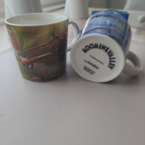 Arabia Muumi mukit, 2 kappaletta. Mukit ovat värikkäitä ja esittävät Muumi-hahmoja eri taustoilla. Toinen on Nuuskamuikkunen (2002-2015) ja toinen Perhe- muki (2002-2009, 2011)