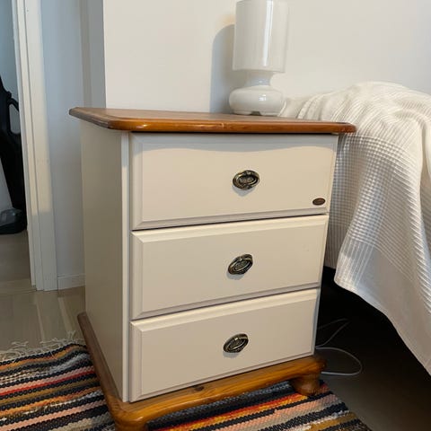 Massiivipuinen (akaasiapuuta) yöpöytä / lipasto 5 laatikolla. Ylätasolla kulumaa, muutoin kunto hyvä. Vain nouto.