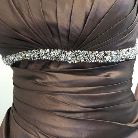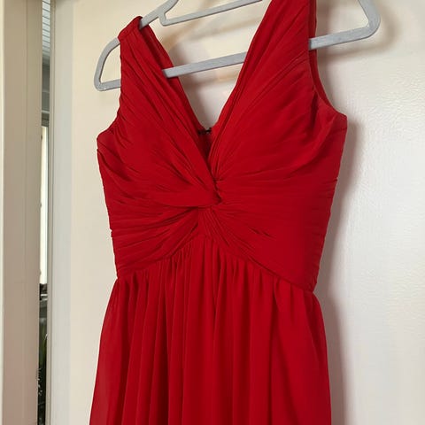 Hyvässä kunnossa oleva punainen puku. Helma on kapeampaa mallia, mikä helpottaa puku päällä liikkumista. Pohjakangas on satiinimainen, ja sen päällä on ohuempaa, kauniisti laskeutuvaa kangasta. V-mallinen kaula-aukko toistuu mekon selkäpuolella. Rintamuksessa kupit. Pukua on käytetty vanhojentanssipukuna, mutta se sopii hyvin myös iltapuvuksi.