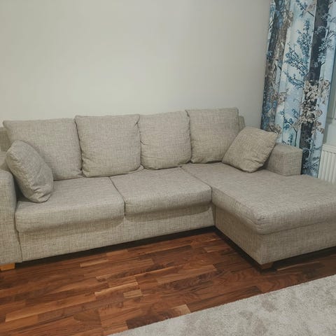 Myydään valkoinen tekonahkainen divaanisohva. Kunto kohtalainen. Saa kahteen osaan. Rivitalo, auton saa eteen, omat kantajat.