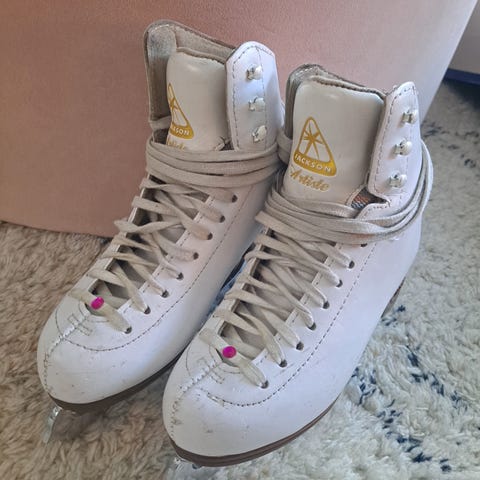 Jackson Mystique taitoluistimet. Koko 3. Kenkä suhteellisen hyvässä kunnossa, terät voisi huoltaa. 40e noudolla Naantalista. Omien menojeni mukaan voin tuoda Raisioon tai Turkuun.
