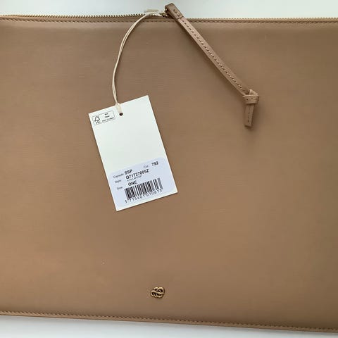 By Malene Birger laukku, jossa musta nahkainen pinta ja kultainen vetoketju. Laukussa on ruudullinen kuviointi ja se soveltuu esimerkiksi kannettavan tietokoneen tai asiakirjojen kuljettamiseen.