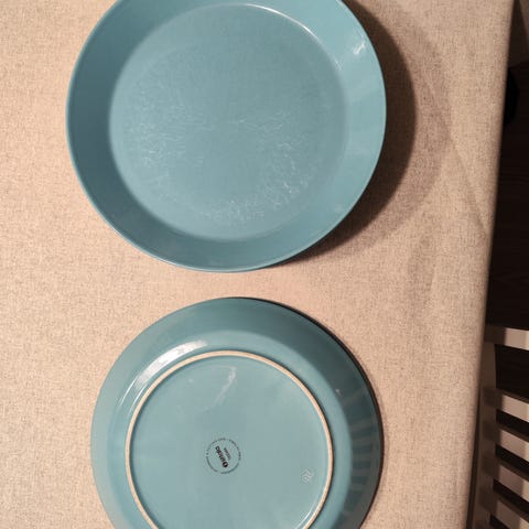 Kaj Frankin muotoilua: kolme vedenvihreää Kartio 40cl eli isompaa juomalasia ja kolme turkoosia Teeman syvää 21cm lautasta ja kaksi matalaa 26cm lautasta. Kaikissa näkyy käytön jälkiä, mutta ei rikkinäisiä.
