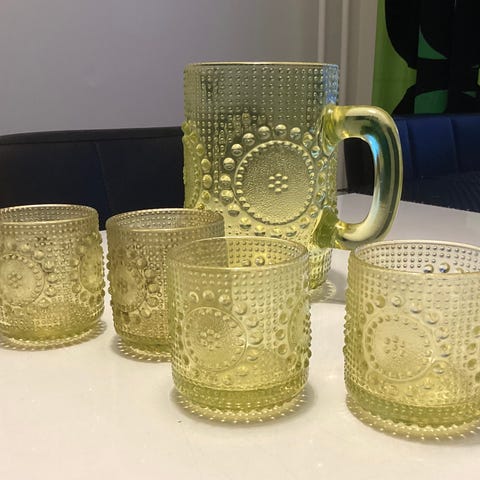 Hienokuntoinen 1970 luvulla valmistettu keltainen lasikannu.