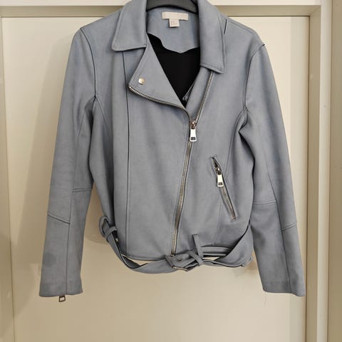 H&M sininen naisten takki, koko 42. Takki on valmistettu materiaalista, joka näkyy kuvassa. Sopii erilaisiin asukokonaisuuksiin ja tarjoaa kevyen suojan viileämmällä säällä.