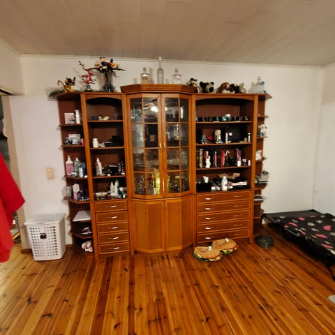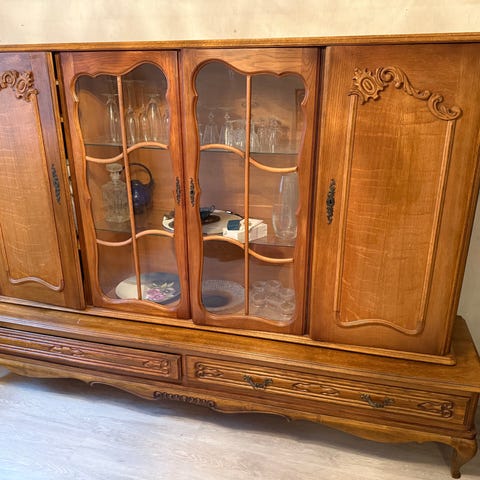 Puinen vitriini ja kaappi, ruokapöytä ja tuolit