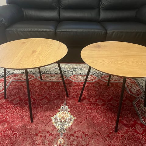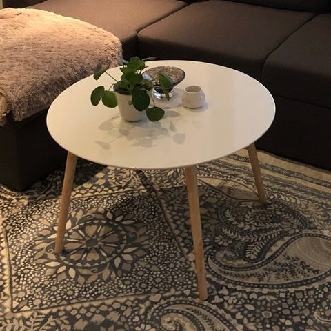 Pyöreä valkoinen sohvapöytä. Pyöreät puiset jalat