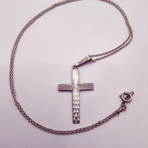 Hopeinen ristikaulakoru. Norjalainen. 50-luvulta. Alkuperäispakkauksessa.