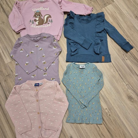 Muutamassa paidassa kokomerkintä 92. Kaikki ollut meillä käytössä koossa 86. Paidat olleet päiväkotikäytössä eli eivät ole uuden veroisia. Vaaleanpunapilkullisessa paidassa kaksi haaleaa tahraa. Muuten kuitenkin hyväkuntoisia.