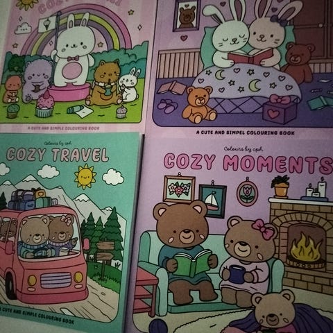 Cozy värityskirja. Käyttämätön. Muutamista värityskuvista kuvat.