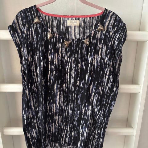 Key Largo -merkkinen musta t-paita, jossa edessä paljeteista muodostuva pääkallo. Koko XS. Leveys kainalosta kainaloon noin 43 cm. Pituus niskasta helmaan noin 57 cm. Pesulappu irrotettu, muilta osin hyväkuntoinen. Materiaali muistaakseni puuvillaa tai viskoosia.
