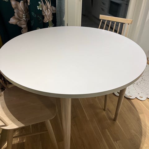 Valkoinen 120cm halkaisija ruokapöytä. Hyvässä kunnossa. Parempaa kuvaa ei nyt ole, pöytä irroitettu jalasta. Jalka painava, pysyy pystyssä.