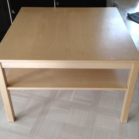 Pöytä on hyvässä kunnossa. Pöytätason alle on lisätty puinen levy TV:n kaukosäätimen ym. säilytykselle (katso kuva).