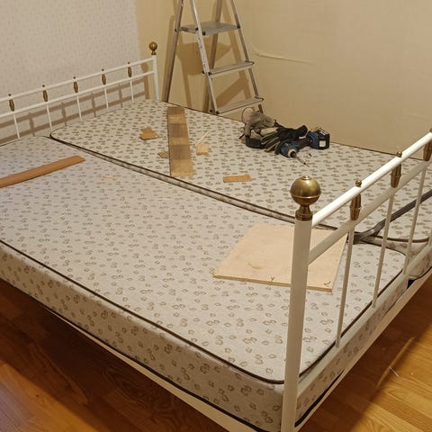 Ostettu käytettynä. Massiivipuuta, ei natise tai heilu. Liian iso omaan asuntoon. Myydään ilman patjaa. Puran osiin helpottamaan kuljetusta. Hissittömän talon toinen kerros. Kissatalous. En kuljeta.