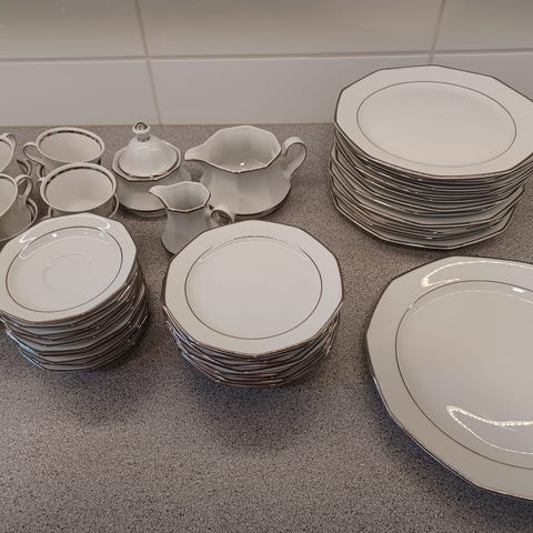 Kokonainen kahviastiasto harvinaisella kukkakuviolla. 8 kuppia, 11 tasselia, 11 leivoslautasta, kahvikannu, kermakko, sokerikko. Vähäisiä käytön jälkiä.