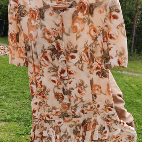 Vähän käytetty mekko koossa 38/40, D-mitoitus. Musta kangas missä vaaleanpunaisia ja valkoisia kukkia, sekä vihreitä lehtiä.