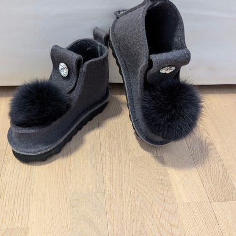 Talvikengät, koko 38. Ruskeaa huopakangasta materiaali, edessä ruskeat nauhat ja timatti koristeet . Kärjessä suuret tummat turkishupsut . Pohjassa musta kumipohja, joka antaa pitoa talvikeleillä. Sopivat talvikäyttöön ja ulkoiluun. Kolme kertaa käytetty.