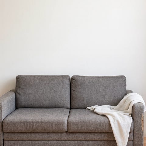 Annetaan vaaleanharmaa vuodesohva. Paljon istuttu, yhä täysin toimiva ja siisti.