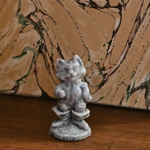 Myydään valloittava, pieni posliininen kissahahmo, joka soittaa viulua. Tämä suloinen keräilyesine kuuluu todennäköisesti arvostettuun englantilaiseen Wade-posliinisarjaan, joka tunnetaan laadukkaista miniatyyrihahmoistaan.
