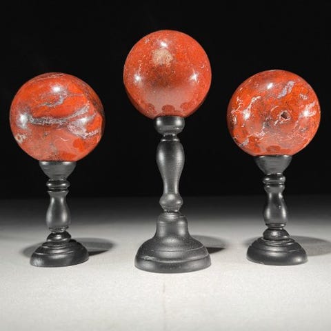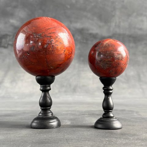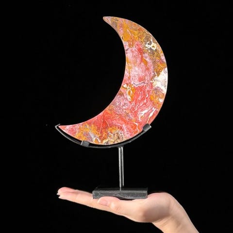 Upeasti kiillotettu kuunsirpin muotoinen koru, valmistettu punaisesta jaspiksesta, omalla jalustallaan.
