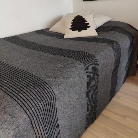 Ompelin pohjakankaan 1990- luvun lopulla käsin, niin siistimpi. Pari tahraa tullut, eivät näy päällikankaassa. Painava, ei liu’u pois paikaltaan helposti.